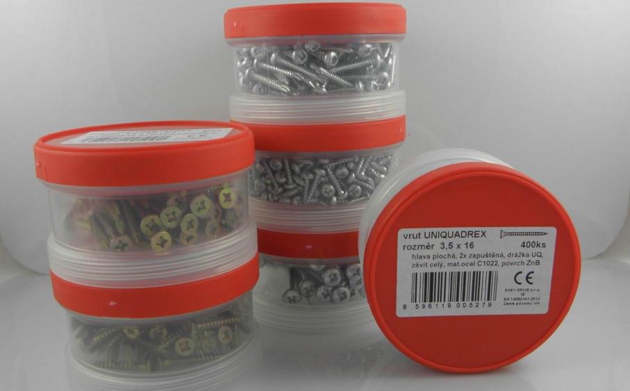 Spojovací materiál s drážkou UNIQUADREX balený v "ešusech" je vhodný pro kutili a drobné řemeslníky z důvodu menších množství v jednotlivých balení.V každém balení je příslušný bit ZDARMA a po spotřebování vrutů lze obal dále využít.Ešusy se na sebe dají vzájemně našroubovávat a je možné je objednat samostatně jako obaly.