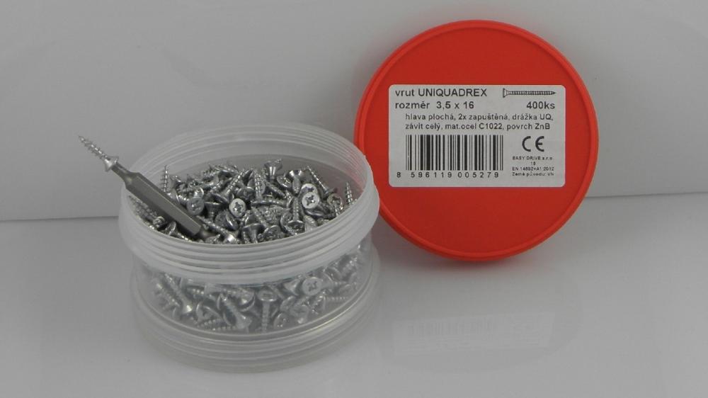 od 1.1.2017 naskladňujeme vruty s drážkou UniQuadrex s přidáním proříznuté špičky a frézy na tělo vrutu - prořez špičky zajistí větší ostrost a výrazně rychlejší a jednoduší vstup i prostup všemi dřevěnými materiály - frézka zlepšuje prostup vrutu delších rozměrů stavebním materiálem snížením stření mezi dříkem vrutu a vnitřkem otvoru - proříznutí špičky od průměru 4,0mm na délce 35mm včetně a výše - na průměru 4,5mm na délce 40mm včetně a výše - na průměru 5,0mm na délce 40mm včetně a výše - na průměru 6,0mm na délce 40mm včetně a výše * frézka potom u všech délek vrutů s částečným závitem