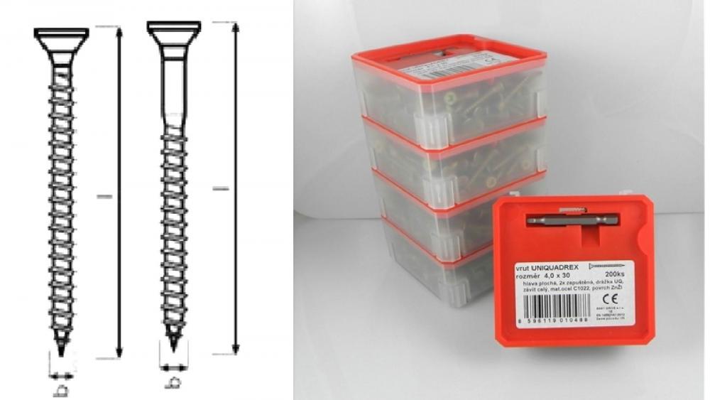 od 1.1.2017 naskladňujeme vruty s drážkou UniQuadrex s přidáním proříznuté špičky a frézy na tělo vrutu - prořez špičky zajistí větší ostrost a výrazně rychlejší a jednoduší vstup i prostup všemi dřevěnými materiály - frézka zlepšuje prostup vrutu delších rozměrů stavebním materiálem snížením stření mezi dříkem vrutu a vnitřkem otvoru - proříznutí špičky od průměru 4,0mm na délce 35mm včetně a výše - na průměru 4,5mm na délce 40mm včetně a výše - na průměru 5,0mm na délce 40mm včetně a výše - na průměru 6,0mm na délce 40mm včetně a výše * frézka potom u všech délek vrutů s částečným závitem