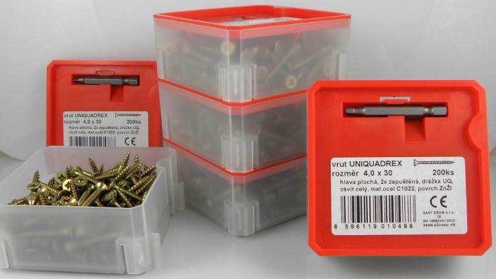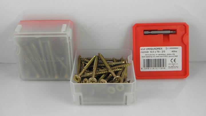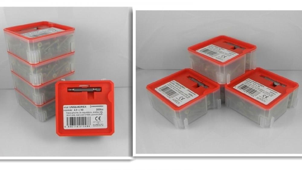Spojovací materiál s drážkou UNIQUADREX balený v Q -boxech je vhodný pro kutili a drobné řemeslníky z důvodu menších množství v jednotlivých balení.V každém balení je příslušný bit ZDARMA a po spotřebování vrutů lze obal dále využít.Q - boxy se na sebe dají vzájemně stohovat a upevňovat vedle sebe do pláství .Je možné je objednat samostatně jako obaly.